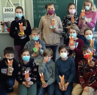 Kurz vor den Osterferien eroberten viel Farbe, Kreativität, Wissenswertes und Kulinarisches den Tagesablauf. Die Grundschülerinnen und Grundschüler bastelten Osterhasen aus verschiedenen Materialien, gestalteten ein Frühlingsbuch und ein Klappbuch. Stolz präsentierten sie ihre Werke. Am letzten Schultag hatte der Osterhase auf dem großen Schulgelände ein paar Überraschungen für die Kinder versteckt, die sichtlich viel Spaß hatten, wenn sie sie aufstöberten.